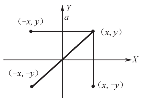 (1)对称点坐标指与点关于轴对称和原点对称的坐标,设平面上点的坐标为(x,y),则其关于X轴的对称点的坐标为(x,-y);关于Y轴的对称点的坐标为(-x,y),关于原点的对称点坐标为(-x,-y),如图2-4所示。