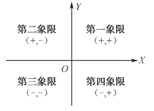 (3)点在4个象限内的坐标值的符号是一定的。例如,在第一象限内,坐标值x>0,y>0均为正值,用(+,+)表示。在第三象限内,坐标值x<0,y<0。用(-,-)表示。同理,在第二象限为(-,+),第四象限为(+,-)。只要知道点的坐标值,就知道它在第几象限,如图2-2所示。