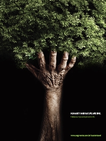 在进行广告创作时,将与主题信息有着直接关系的视觉元素组合在一起,以此打造出意图明确的广告画面。形象化的广告创意使画面的主题信息得到最为直观的传达,相较于抽象化与具象化两种表现形式,它也更容易使消费者明白画面的具体含义。采用形象化的表现方式,能够给人一目了然的视觉感受,但同时要避免画面过于直白与简单,否则会削减消费者的感知兴趣。在左图所示的广告中,设计者通过一个托起的动作为受众形象地表现了“环保”这一主题。