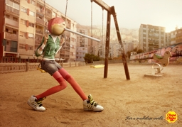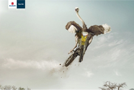 拟人型是指设计者通过特定的艺术手段,将具有人格化特质的元素添加到物象之上,并使其拥有人物的某些特征。我们利用拟人型创意来赋予事物生命力,并对广告的推广起到积极的影响。如右图所示的画面中,骑着摩托的鸵鸟以拟人化的姿态出现在观者眼前,从而在心理上给观者留下一种亲切且人性化的感受。