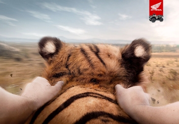 比喻型是指设计者在广告画面中运用比喻的手法来进行主题的修饰。在广告设计中,我们通过比喻手法使产品的形象变得生动具体,从而加深消费者对广告的印象,比喻的类型共分为3种,即明喻、暗喻与借喻。如左图所示,设计者将越野车比做老虎,通过表现直观的明喻手法,将简单明了的主题信息传递给受众。
