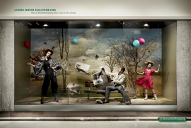 生活在现代大都市的人们,都有追求流行与时尚的心理,换句话说,也就是社会大众认为含有流行与时尚元素的事物就是美的。如右图所示,设计者通过在广告中展现带有流行与时尚感的服装要素,从而建立起时装品牌的权威性,同时感染受众并使其产生认同主题的心理。