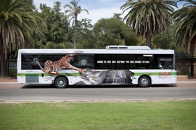 随着商业的不断发展,广告已成为商家对外进行产品宣传的必要手段,如今广告业内的相互竞争也随之迅速加大,为了吸引消费者的视线,设计者们首先要了解他们的心理需求,比如商品的价格、性价比和信誉等。如右图所示,设计者将动物与车体广告结合在一起,以使消费者对广告主题产生兴趣,从而提高广告的关注度。