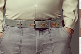 在广告中,设计者有意识地采用直陈的方式进行主题说明,从而将设计对象的特色,以及他们想要表达的概念直接传递给受众,因此运用直接暗示的方式进行主题阐述的广告也比较容易被消费者接受。在右图所示的广告中,设计者将图案与皮带结合在一起,从而使消费者在接触到广告时就能联想到节食的主题。