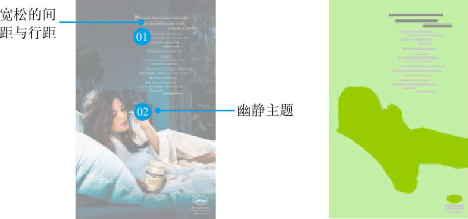 ① 细腻的字体配合宽松的行距与间距,营造出舒缓的阅读感,与恬静的广告画面相互呼应。