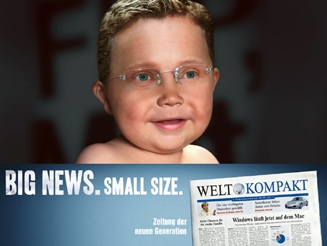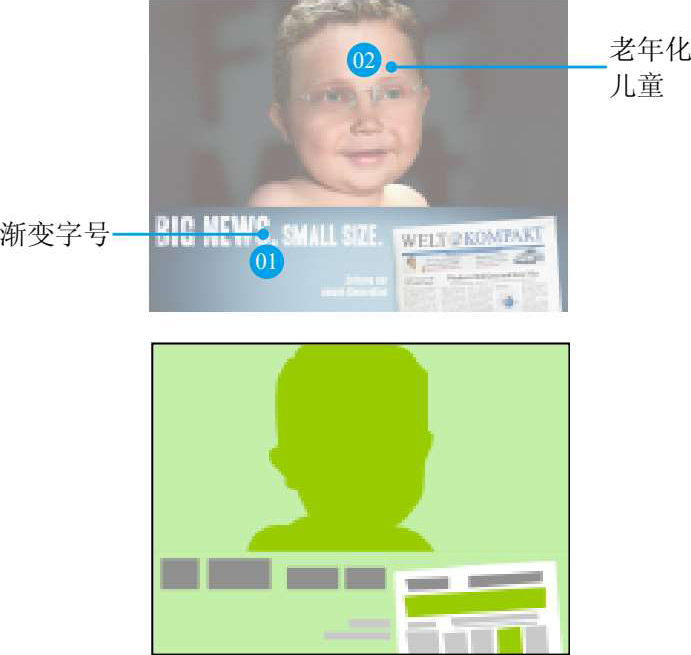① 儿童的老年化装扮会带给观者忍俊不禁的视觉效果,同时还形象地表达出了主题。