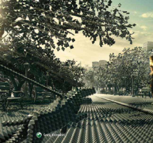 层次关系是指画面中主体物与背景的空间关系,在广告设计中,主体物即为画面的视觉重心,它的作用在于以直观的形象表现主题,而背景则起到烘托气氛的作用。对于广告来讲,处理好空间的层次关系能提高画面的识别性与审美性。如左图所示,设计者利用具有规律性变化的投影要素来打造层次感强烈的视觉效果。