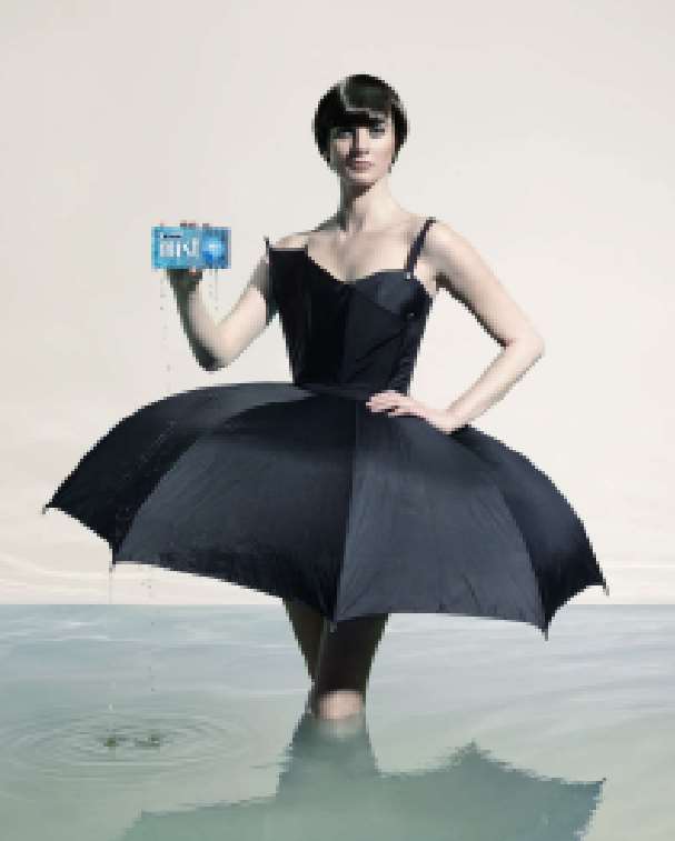 在广告设计中,空间是集结各种视觉元素的重要载体,每一个空间都有虚实之分,我们将占有空间位置的物体称为实体,然后把形体之外的物体,如图形、文字和色彩等称为虚空间。实体的主要作用在于通过明朗的形象以直观的方式阐述主题,而虚空间则是营造氛围的最佳对象。在左图所示的广告中,利用对虚实空间的强调来突出主体物的视觉形象。