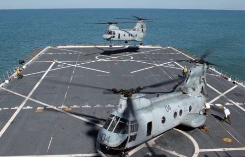 CH-46E“海上骑士”直升机停驻在两栖运输舰上