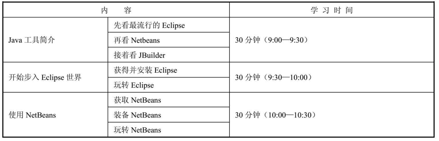 本章简要介绍了Java中常用开发工具的基本知识,表2-1是我的学习时间进度表。