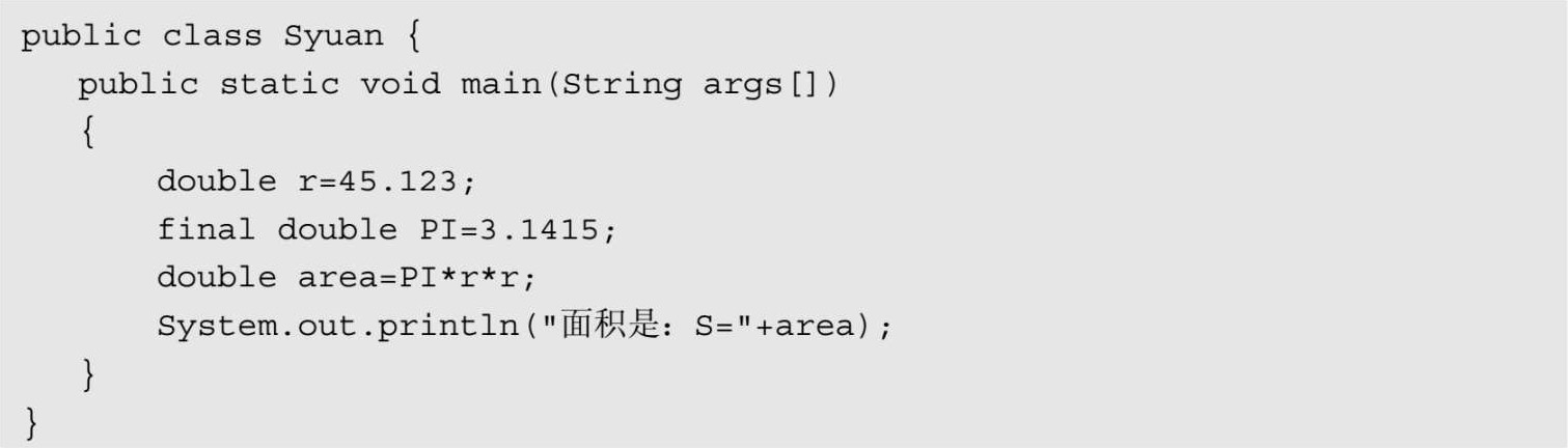 我:“现在来看这个问题就很简单了,因为涉及圆周率,所以需要浮点型数据。看我的解决思路:① 定义变量r和PI,分别表示半径和圆周率,并分别赋值;② 通过println分别输出此圆的面积。”