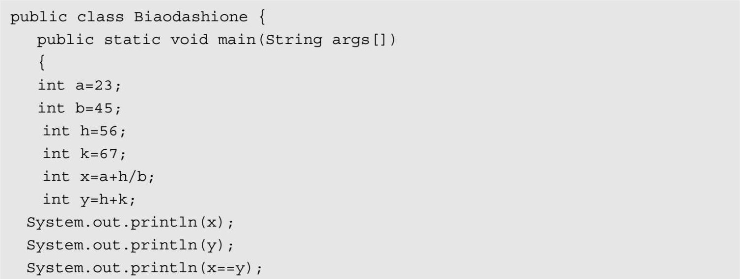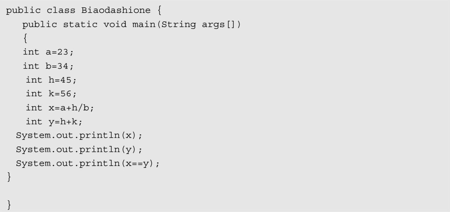 在Java 编程语言中,算术运算符组成的表达式运算顺序是先乘除,再加减,与代数中的式子一样。在此算出x和y,然后比较x==y是否相等,得到false结果。下面通过一段代码进行理解和认识,其代码【光盘:源代码/第4章/biaodashitwo.java】如下: