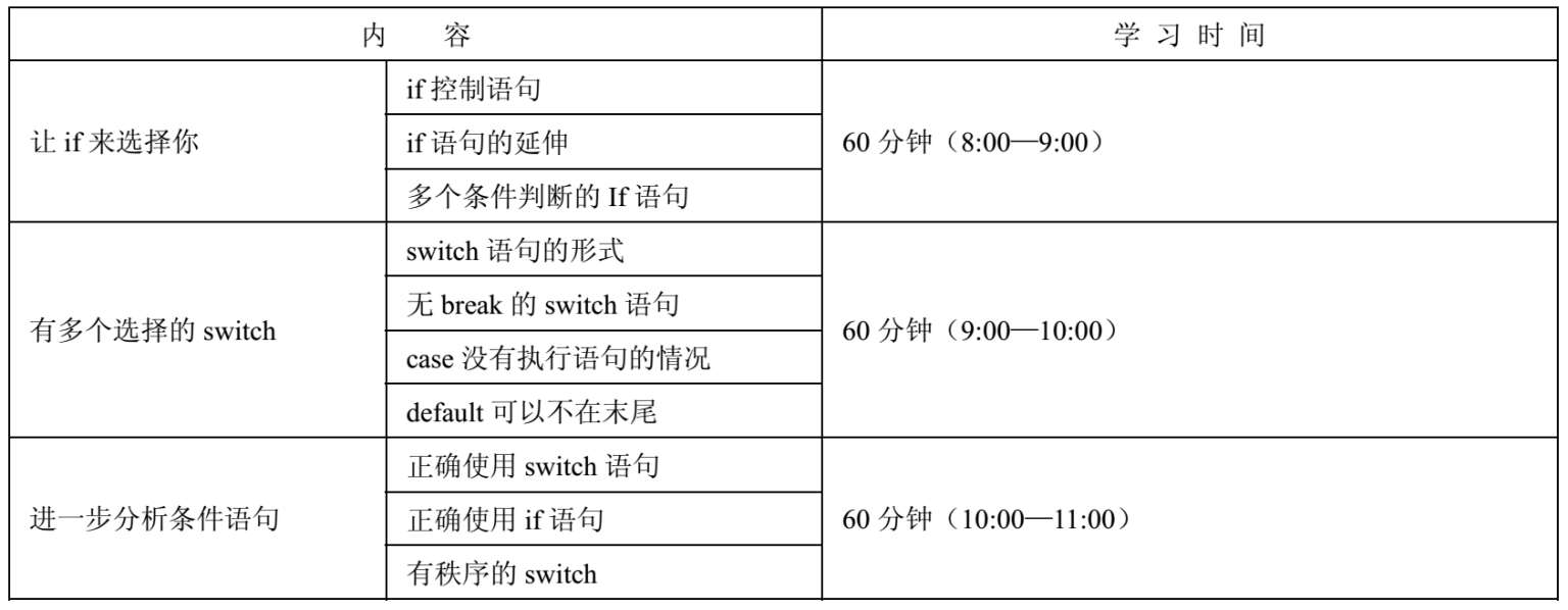 本章详细讲解了Java条件语句的基本知识,表5-1是我的学习时间进度表。