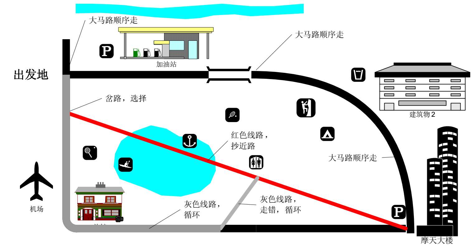 KNOWALL:“我给你举个通俗的例子,你想从家中去超市买东西,最简单的路线是顺着大路一直走,这条一直走的路线是顺序结构;假如你想省近路抄小道,则需要拐进小胡同,进入胡同后会有很多个岔路口,在此需要选择一条岔路继续行走,选择的过程就是选择语句实现的;如果你走错了,发现走了半天又回到原来的岔路口,这个过程就是一个循环。上述过程的示意图如图6-2所示。”