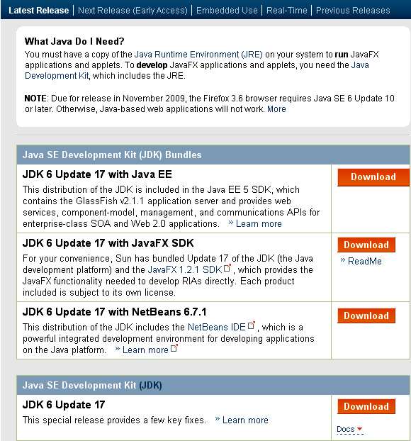 第2步:在图1-4中可以看到有很多版本,运行Eclipse时,虽然只需要JRE就可以了,但是在开发Android应用程序的时候,需要完整的JDK(JDK已经包含了JRE),且要求其版本在1.5以上,这里选择Java SE (JDK) 6,其下载页面如图1-5所示。