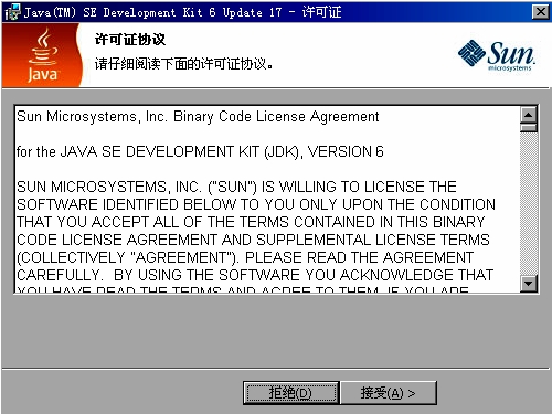 第5步:下载完成后双击“jdk-6u17-windows-i586-p.exe”文件开始进行安装。将首先弹出“许可证协议”对话框,在此单击“接受”按钮,如图1-8所示。