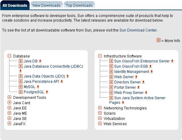 第1步:在使用Java开发之前,需要先搭建其开发环境,即需要JRE的支持。在Windows上安装JRE/JDK非常简单,首先在Sun官方网站下载,网址为http://developers.sun.com/downloads/,如图1-4所示。