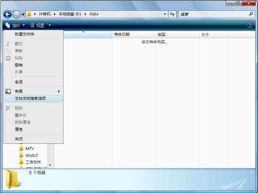 (1)打开任意一个磁盘,在组织下拉列表中选择“文件夹和搜索选项”命令,如图1-18所示。