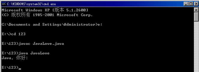 (3)输入Javac和Java命令将源文件进行编译和执行,操作后如图1-23所示。
