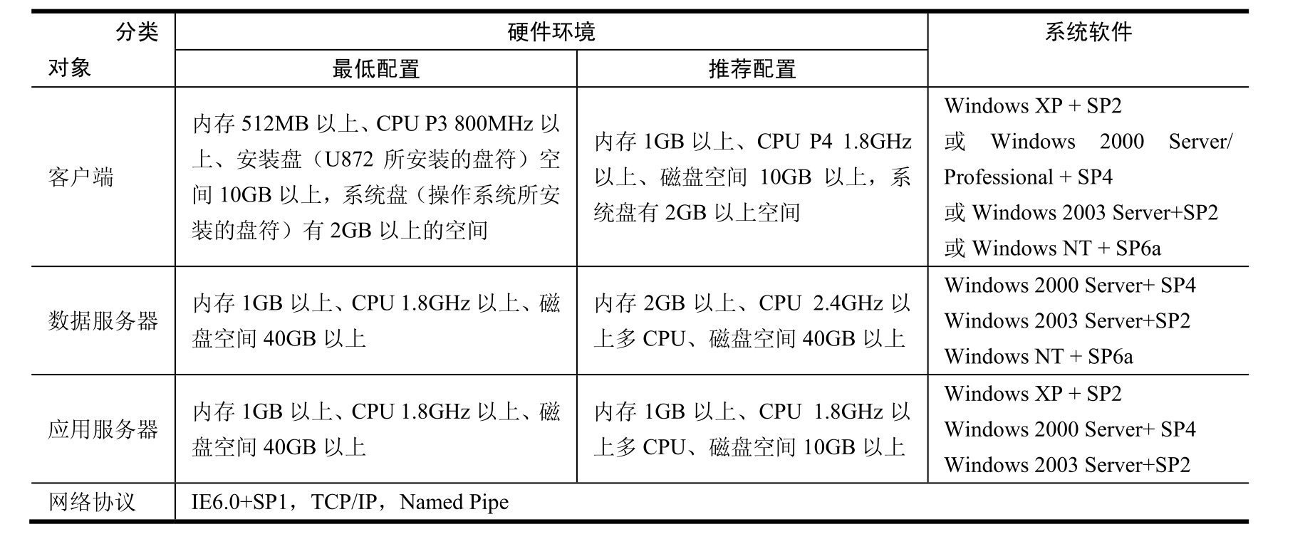 用友ERP-U8管理软件属于应用软件范畴,需要按以下要求配置硬件环境、准备系统软件,如表1-1所示。