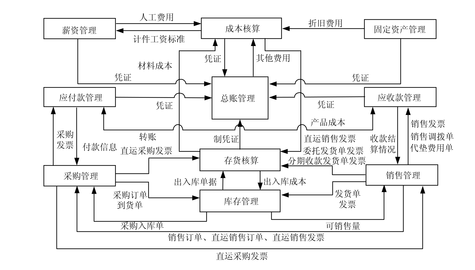 为了使大家对财务业务一体化运行模式有总体认识和了解,我们需要清晰地描述这些模块之间的数据关系(如图1-2所示)。