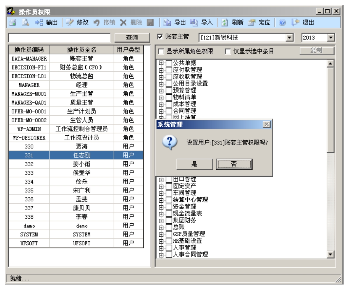 ④ 单击【是】按钮,任志刚拥有了账套主管权限。