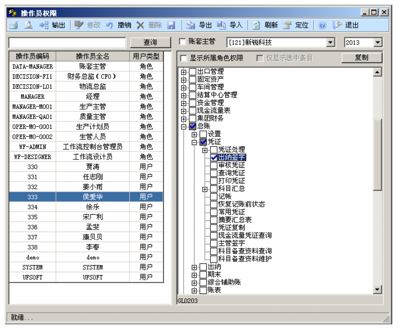 系统管理员和账套主管都可以给操作员赋权。在建立用户时,已经给侯爱华赋予了“出纳”角色,但出纳角色中不含“出纳签字”功能,下面我们为侯爱华赋予“出纳签字”功能。