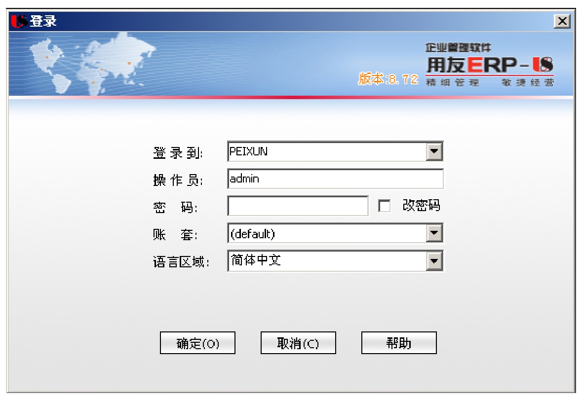 ④ 在“操作员”文本框中显示用友软件默认的系统管理员“admin”,系统默认管理员密码为空,如图2-2所示。