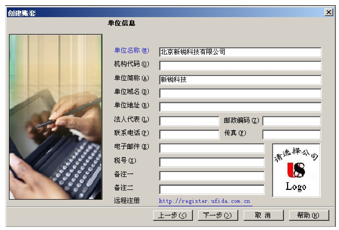 单位名称:用户单位的全称,必须输入。企业全称只在发票打印时使用,其余情况全部使用企业的简称。本例输入“北京新锐科技有限公司”。