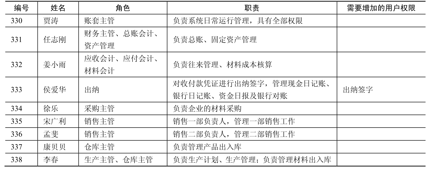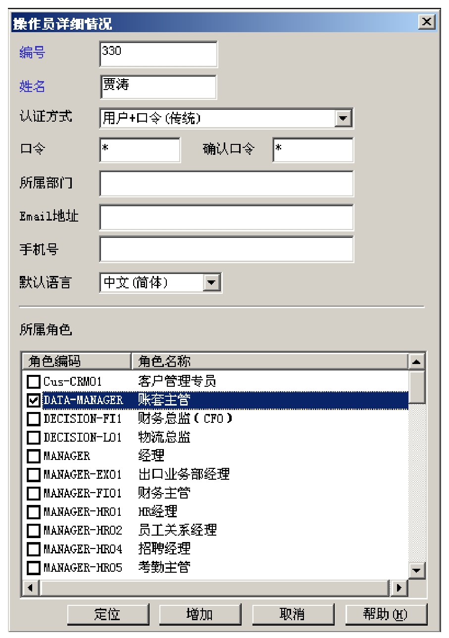 ③ 按表2-1中所提示的资料输入操作员信息,按角色提示在增加用户时指定用户所属的角色,如图2-3所示。每增加完一个用户后,单击【增加】按钮,然后继续增加下一位用户,全部完成后,单击【取消】按钮返回。