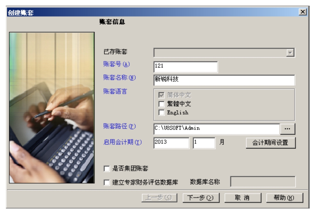 已存账套:系统将已存在的账套以下拉列表框的形式显示,用户只能查看,不能输入或修改,目的是为了避免重复建账。