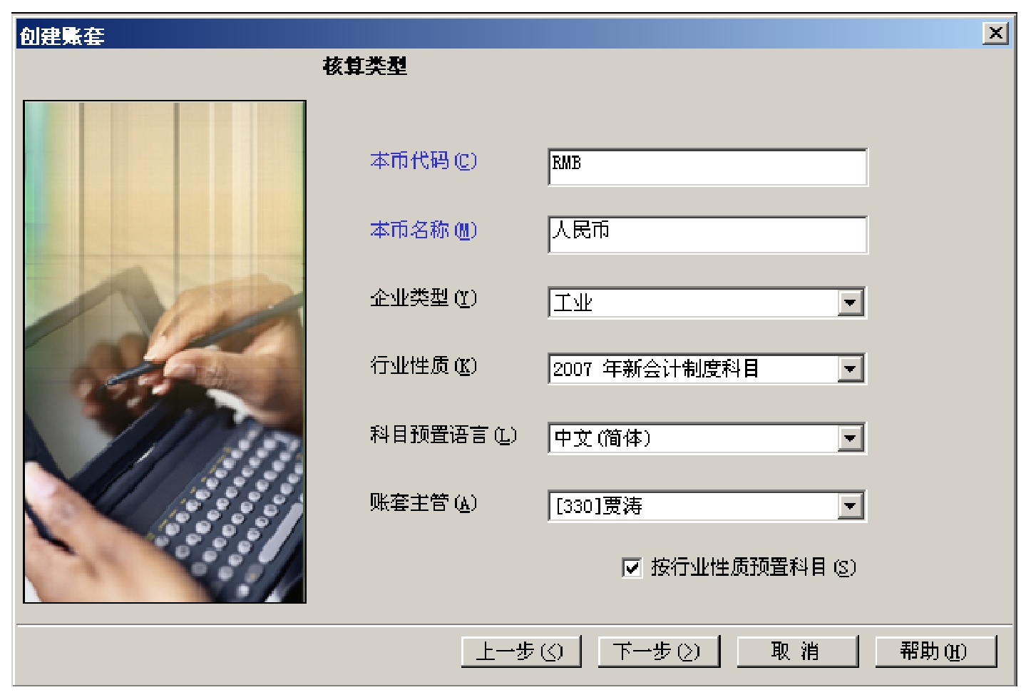 行业性质:用户必须从下拉列表框中选择输入,系统按照所选择的行业性质预置科目。本例采用系统默认的“2007年新会计制度科目”。