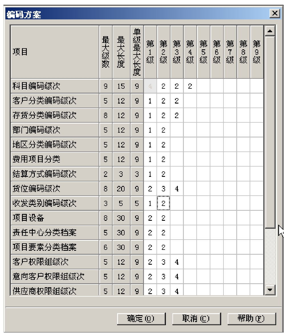 为了便于对经济业务数据进行分级核算、统计和管理,系统要求预先设置某些基础档案的编码规则,即规定各种编码的级次及各级的长度。