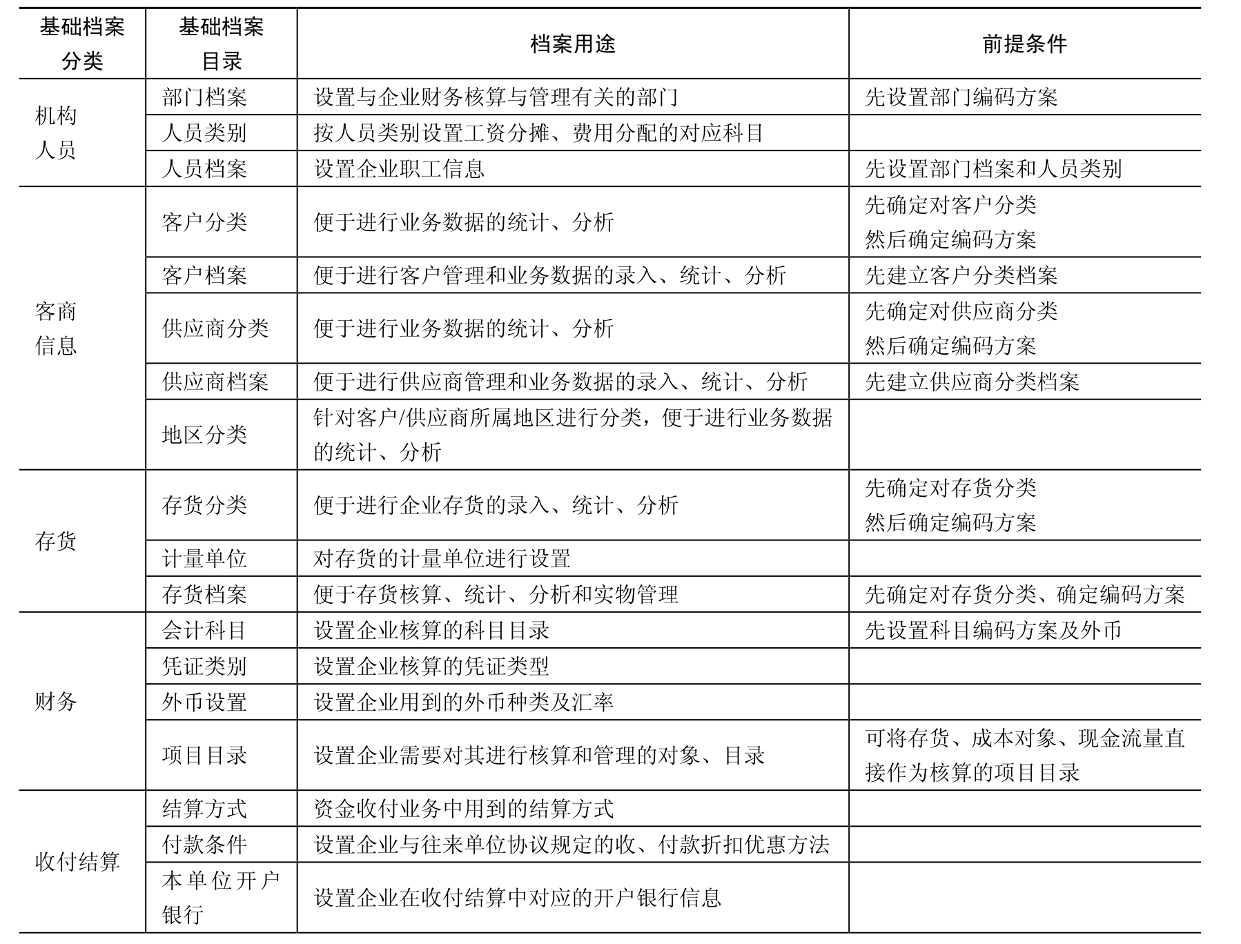 基础档案是计算机系统运行必需的基础数据。计算机信息处理的优势主要表现在数据处理速度快、精确度高、分析统计汇总方便等方面,而基础档案是计算机进行汇总统计的依据。用友ERP-U8管理软件需要的基础数据不仅涉及财务部门,还大量涉及业务部门,因此数据收集、整理的工作量很大。