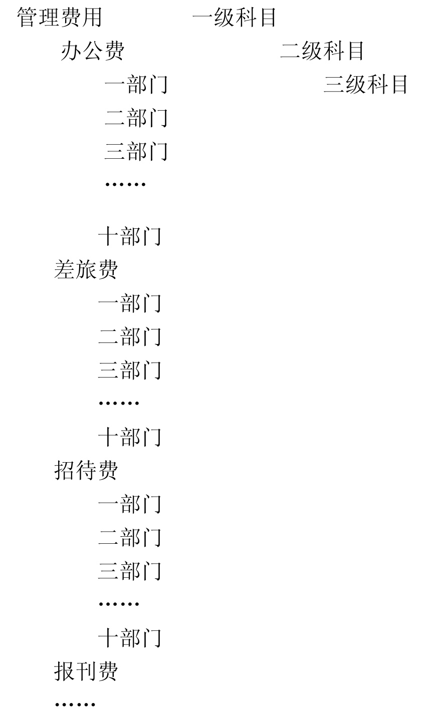 辅助核算是ERP财务管理系统的特色之一。在传统的手工处理方式下,一般采用设置明细科目的方式来满足特殊的细化核算要求。如果管理者需要了解每月各职能部门各项费用的发生情况,在手工方式下通常这样设置科目: