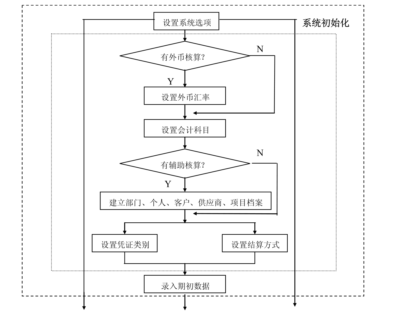 (1)系统初始化阶段,与总账相关的基础档案(内框包含的部分)在企业应用平台中进行设置,此处仅为列示,以保证体系的完整性。