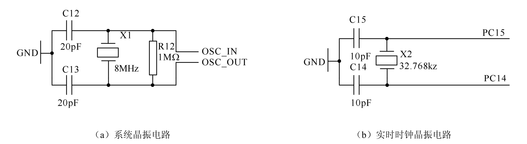 注意: 上述的延时函数是在外部晶振为8MHz,内部锁相环(Phase Lock Loop,PLL)设置为9倍频的情况下设计的,这两个函数所产生的延时都经过示波器测试过。如果外部晶振频率不是8MHz,调用这两个函数所产生的真正延时就会发生变化。晶振电路如图2.3所示。图2.3(a)是系统晶振电路。