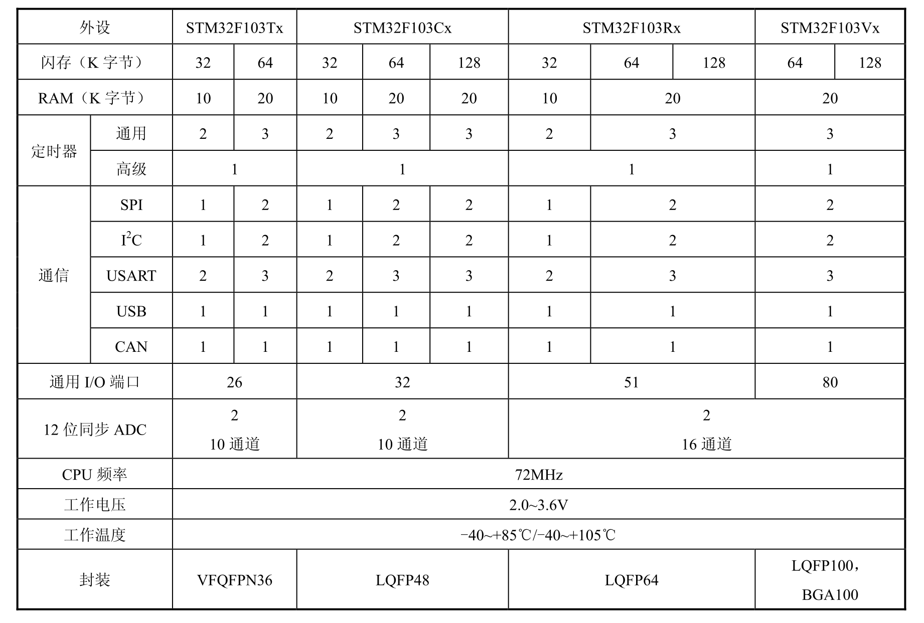表1.1 STM32F103xx增强型微控制器各系列的外设资源