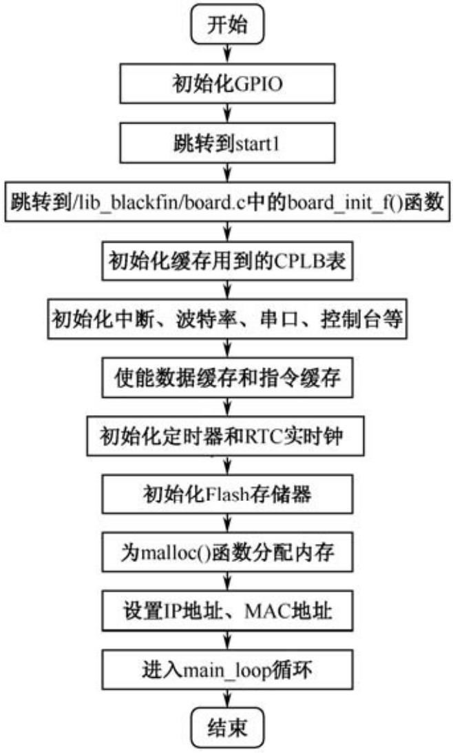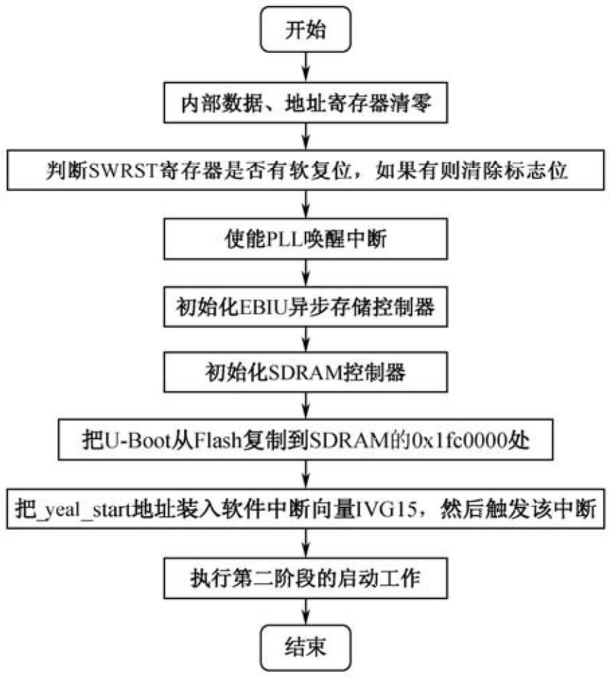 首先定义代码段的起始地址是((32 * 1024*1024) - (256 << 10)),即0x1fc0000,这个地址就是配置文件中定义的CFG_MONITOR_BASE的地址,也就是U-Boot的起始地址。存放的第一个文件是/cpu/bf537/start.o,该文件是U-Boot的入口文件,即最早执行的文件,其次是cpu/bf537/start1.o文件。看上去U-Boot是从0x1fc0000开始执行的,事实上并非如此,因为U-Boot是烧写在Flash中的,而目标板的启动模式是从Flash直接启动,也就是说是从Flash的起始地址0x20000000开始执行的。关于启动模式的问题将在下节讨论,这里仅研究U-Boot的启动过程。实际上U-Boot的确是从0x20000000开始执行的,本阶段的启动过程如图4.12所示。
