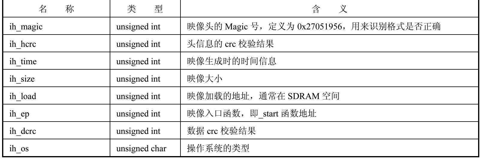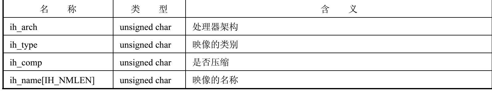 image_header_t在include/image.h文件中定义,宏IH_NMLEN定义为32,因此整个头信息的长度为64字节,这个64字节的头信息是U-Boot启动特有的要求。µClinux内核映像必须加上64字节的头信息才能被U-Boot引导,否则不能被识别,各成员变量的含义如表4.10所示。