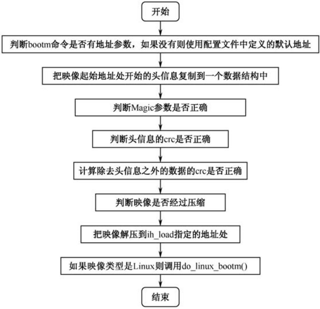 其中0x20020000是µClinux内核的存放地址。由于bootcmd的内容是bootm,所以程序会跳转到do_bootm()执行bootm命令。do_bootm函数在/common/cmd_bootm.c中实现,下面重点分析该函数的启动过程。在分析该函数之前,首先了解一个数据结构image_header_t,该结构存放µClinux映像的头信息,在bootm过程中用到。