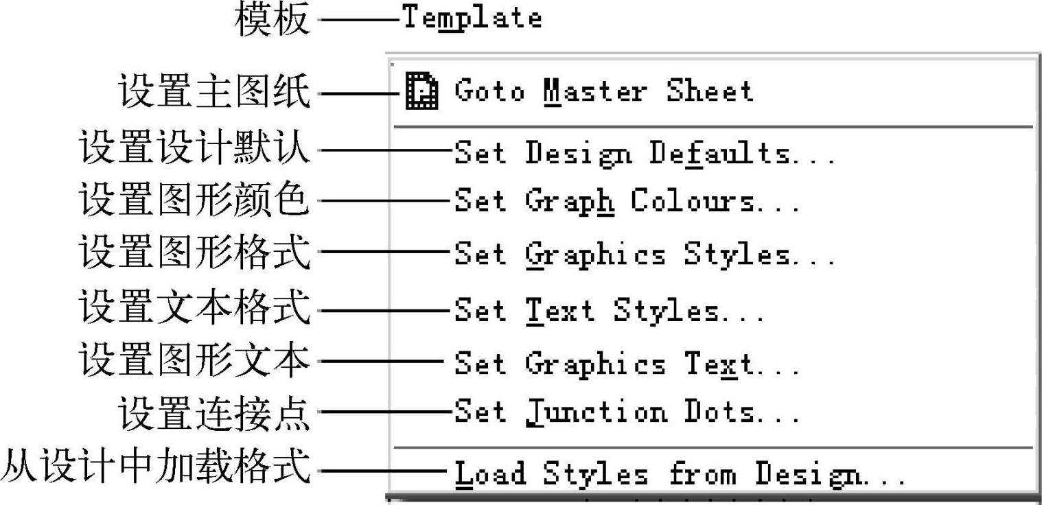 【Template(模板)】 如图2-12所示,它主要完成图形、颜色、字体、连线设置等功能,快捷键为“Alt+M”。