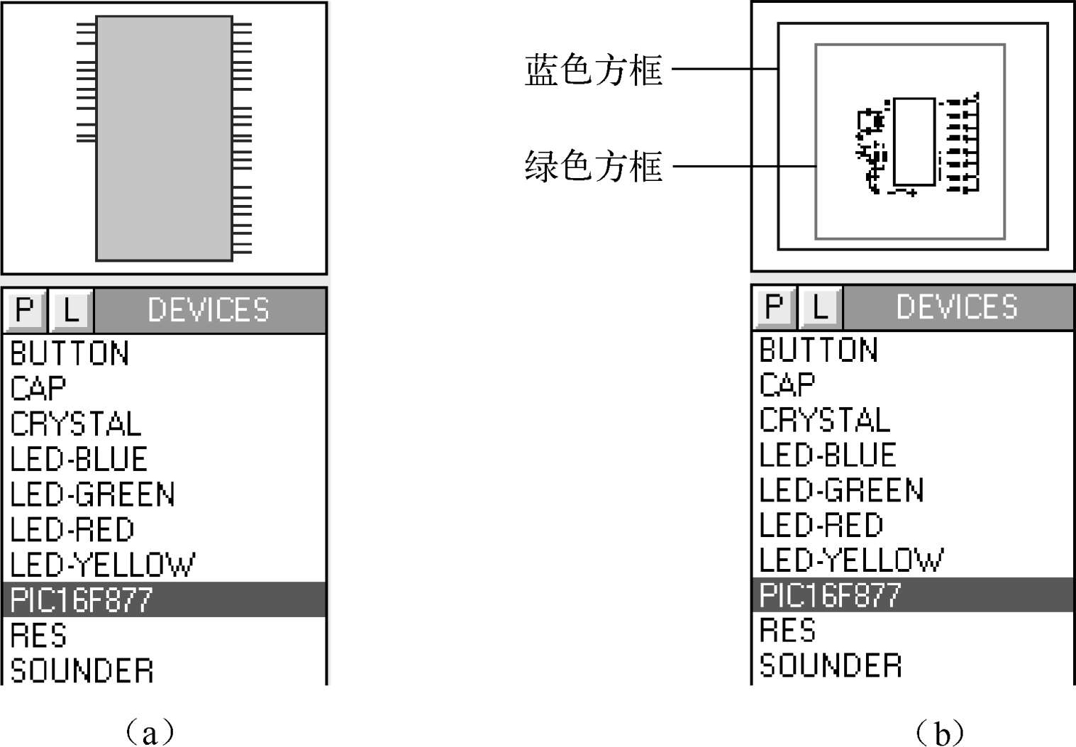 时,它会显示整张原理图的缩略图,并显示一个绿色方框和一个蓝色方框,绿色方框里的内容就是当前原理图编辑窗口中显示的内容,可用鼠标在它上面单击来改变绿色方框的位置从而改变原理图的可视范围,蓝色方框内是可编辑区的缩略图,如图2-14(b)所示。