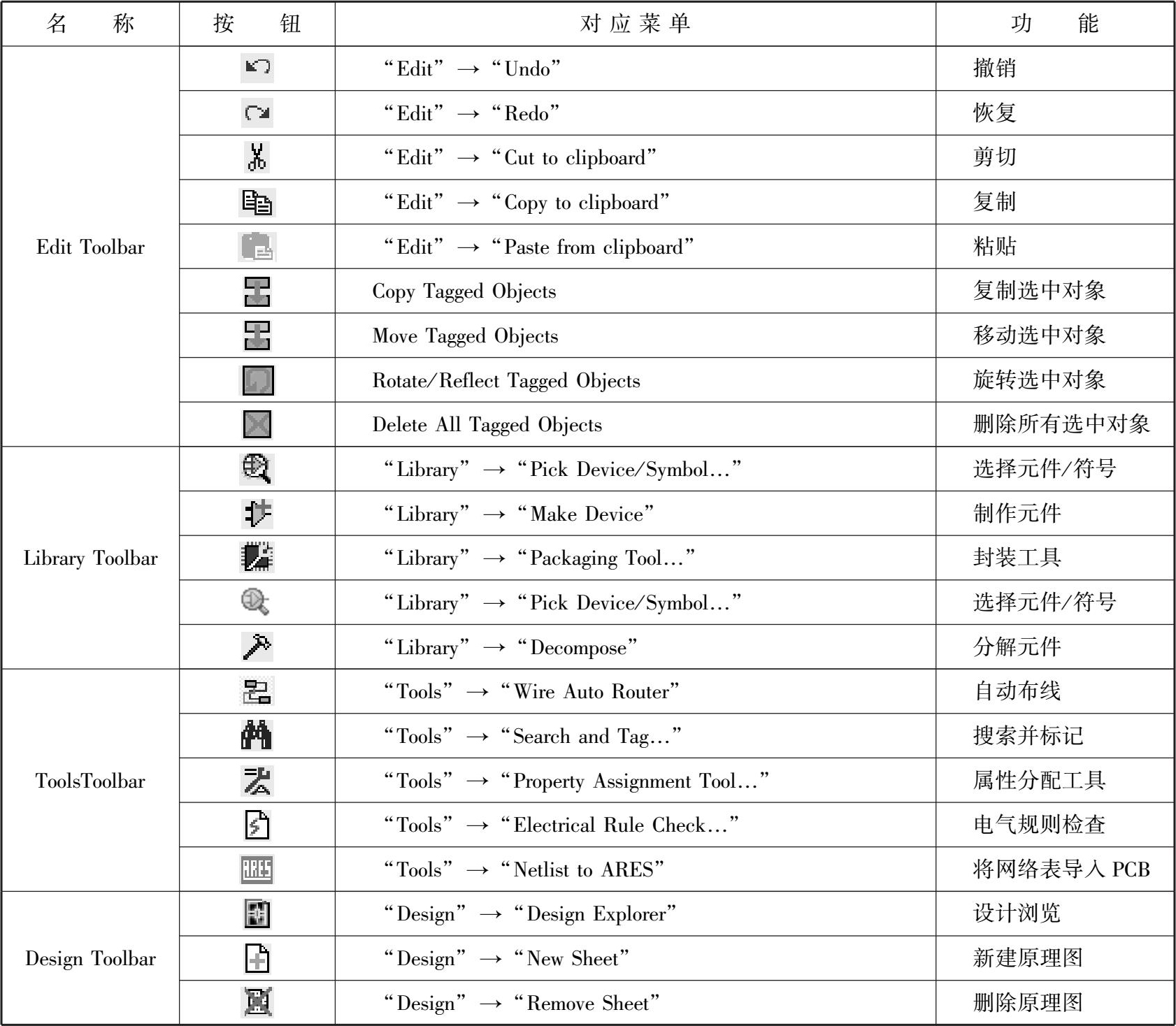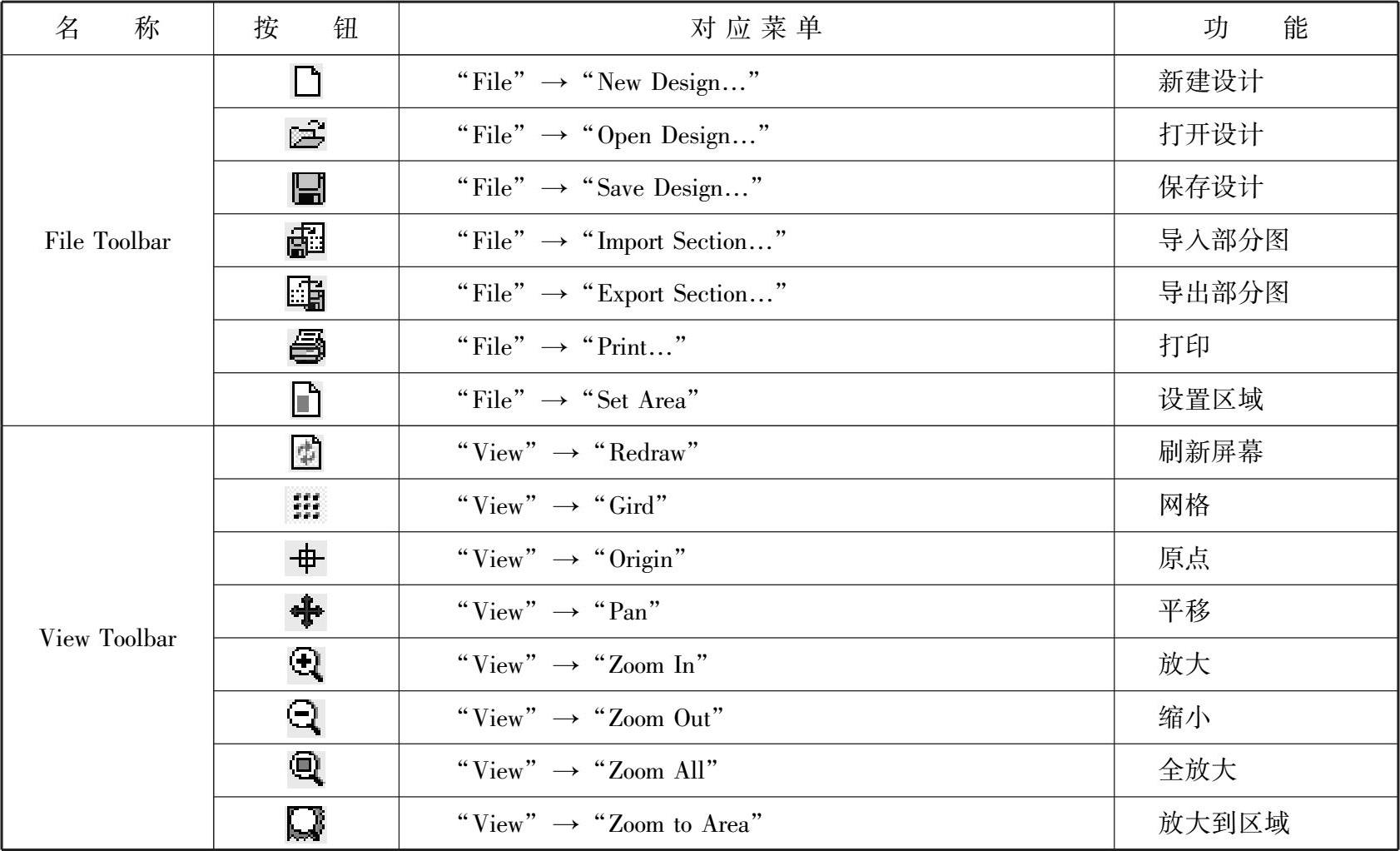 (2)主工具栏:Proteus ISIS的主工具栏包括File Toolbar(文本工具条)、View Toolbar(查看工具条)、Edit Toolbar(编辑工具条)和Design Toolbar(调试工具条)4部分。这4部分工具条的打开与关闭均可执行菜单命令“View”→“Toolbar…,在弹出的对话框中进行设置即可(复选框中显示“√”表示该工具条打开)。主工具栏中的每个按钮对应一个具体的菜单命令,如表2-1所示。