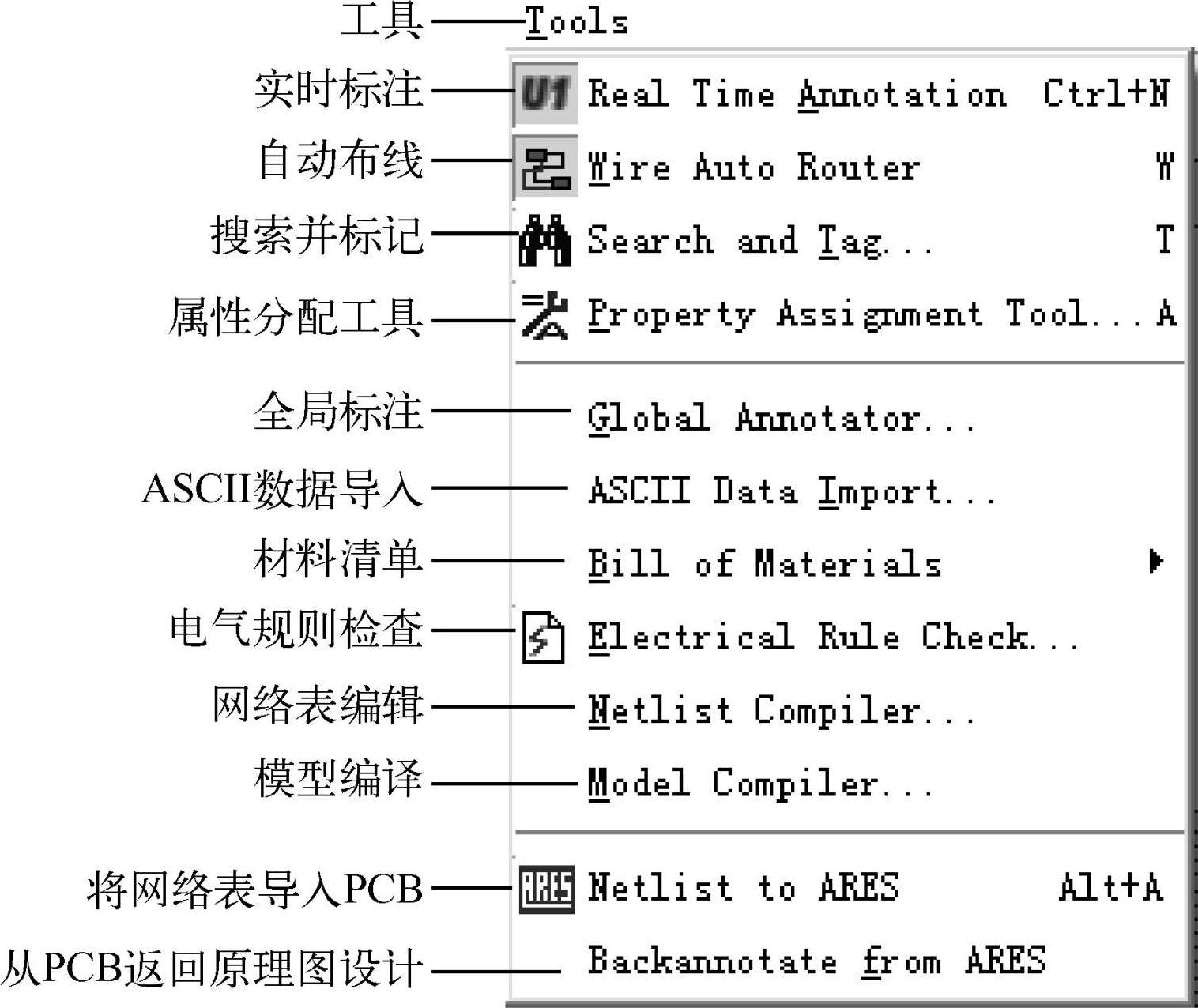 【Tools(工具)】 如图2-6所示,它具有实时标注、自动布线、搜索并标记、属性分配工具、全局标注、ASCII数据导入、材料清单、电气规则检查、网络表编辑、模型编译、将网络表导入PCB、从PCB返回原理图设计等功能,快捷键为“Alt+T”。