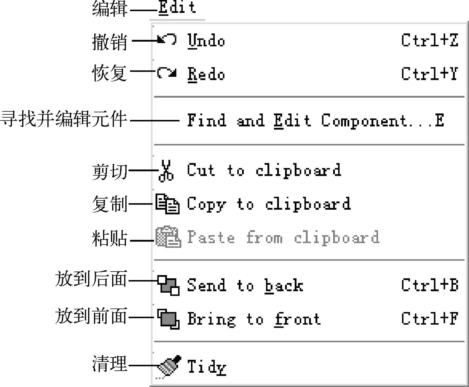 【Edit(编辑)】 对原理图编辑窗口中的元件进行剪切、复制、粘贴、撤销、恢复等操作,如图2-5所示,快捷键为“Alt+E”。
