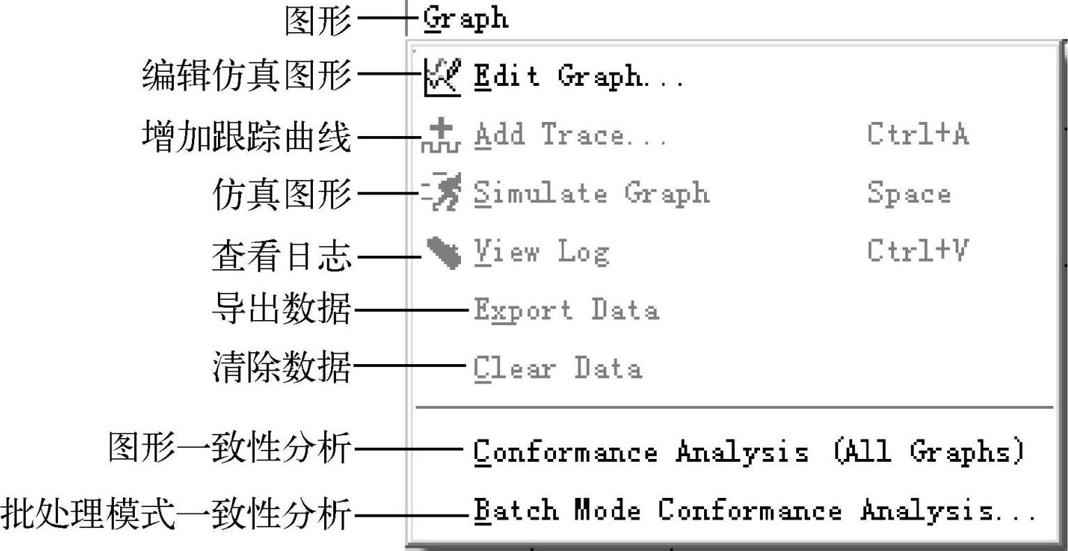 【Graph(图形)】 如图2-8所示,它具有编辑仿真图形、增加跟踪曲线、仿真图形、查看日志、导出数据、清除数据、图形一致性分析、批处理模式一致性分析等功能,快捷键为“Alt+G”。