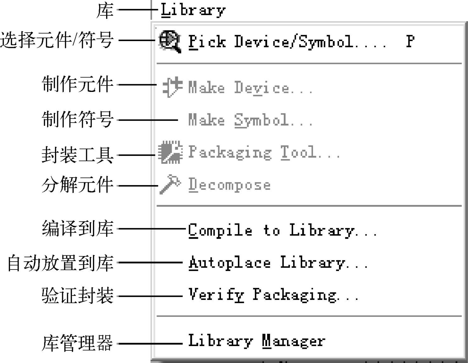 【Library(库)】 如图2-11所示,它具有选择元件/符号、制作元件、制作符号、封装工具、分解元件、编译到库、自动放置到库、验证封装、库管理器等功能,快捷键为“Alt+L”。