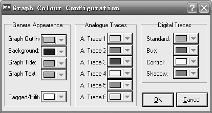 执行菜单命令“Template”→“Set Graph Colours…,弹出如图2-17所示对话框,进行图形颜色的设置。在此对话框中,可设置图形轮廓(Graph Outline)、底色(Background)、图形标题(Graph Title)、图形文本(Graph Text)的颜色;设置模拟跟踪曲线(Analogue Traces)中不同曲线的颜色;设置数字跟踪曲线(Digital Traces)的颜色。