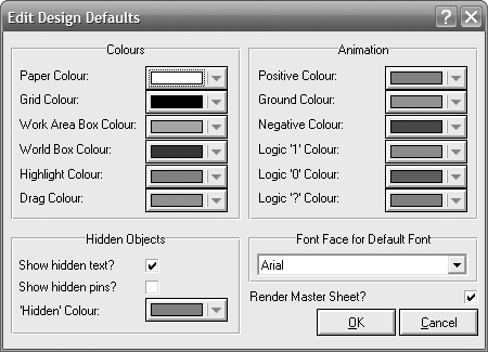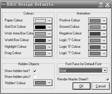 【模板的设置】 执行菜单命令“Template”→“Set Design Defaults…,弹出如图2-16所示对话框,进行设计默认值的设置。在此对话框中,可设置纸张(Paper)、网格点(Gird Dot)、工作区(Work area Box)、提示(Highlight)、拖动(Drag)等项目颜色;设置电路仿真(Animation)时正(Positive)、负(Negative)、地(Ground)、逻辑高(1)/低(0)等项目的颜色;设置隐藏对象(Hidden Objects)是否显示及颜色;设置默认字体(Font)。